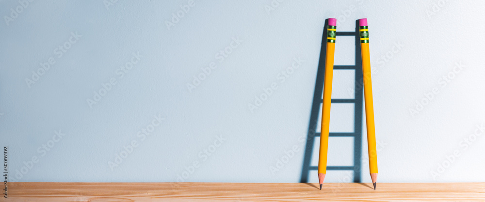 Fotografie Two Pencils On Desk Casting Shadow Of Ladder - Success Through Education Concept