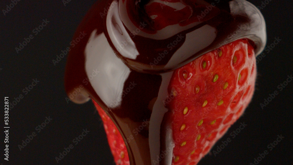 Fotografie macro strawberry chocolate drip slow motion liquid cocoa delicious food lust