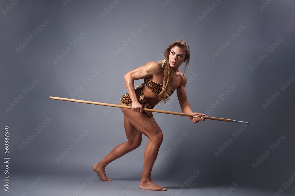 Fotografie Muscular female prehistoric hunter crawling with spear
