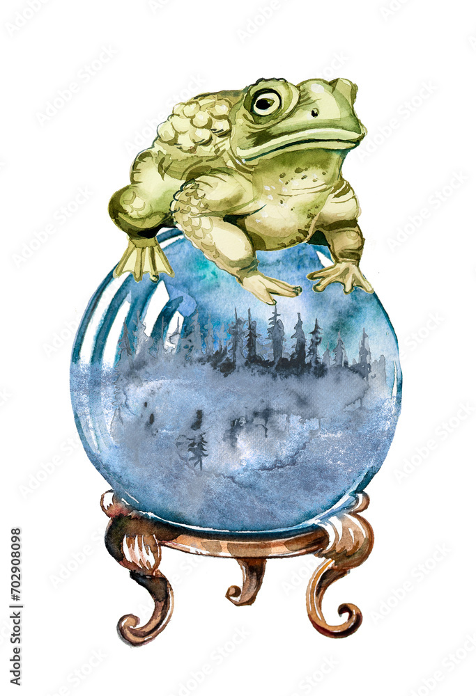 Fotografie Watercolor magic crystal ball, fortune teller with predictions and positive affirmations and frog