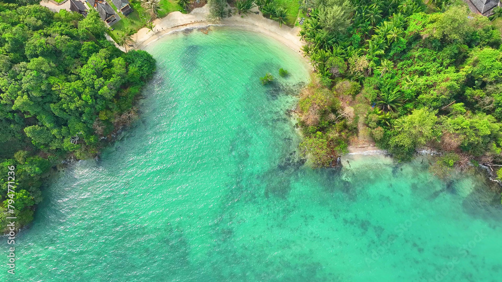 Fotografie A breathtaking tropical paradise with pristine, curved beaches, crystal-clear waters, and luxurious resorts nestled amid lush, tropical greenery