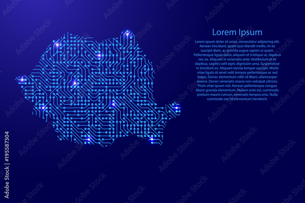 Tablou pe pânză Map Romania from printed board, chip and radio component with blue star space on the contour for banner, poster, greeting card, of vector illustration