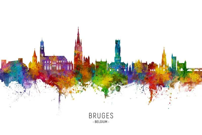 Autocolant Bruges Belgium Skyline Cityscape Painting Watercolor