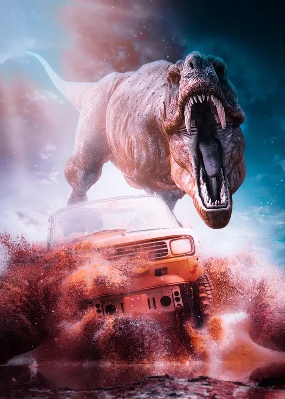 Tablou pe pânză The Tyrannosaurus attack car in desert