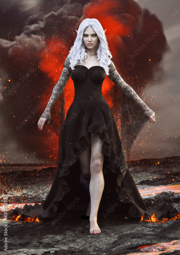 Tablou pe pânză Portrait of a powerful dark elf sorceress walking through the lava fields unscathed