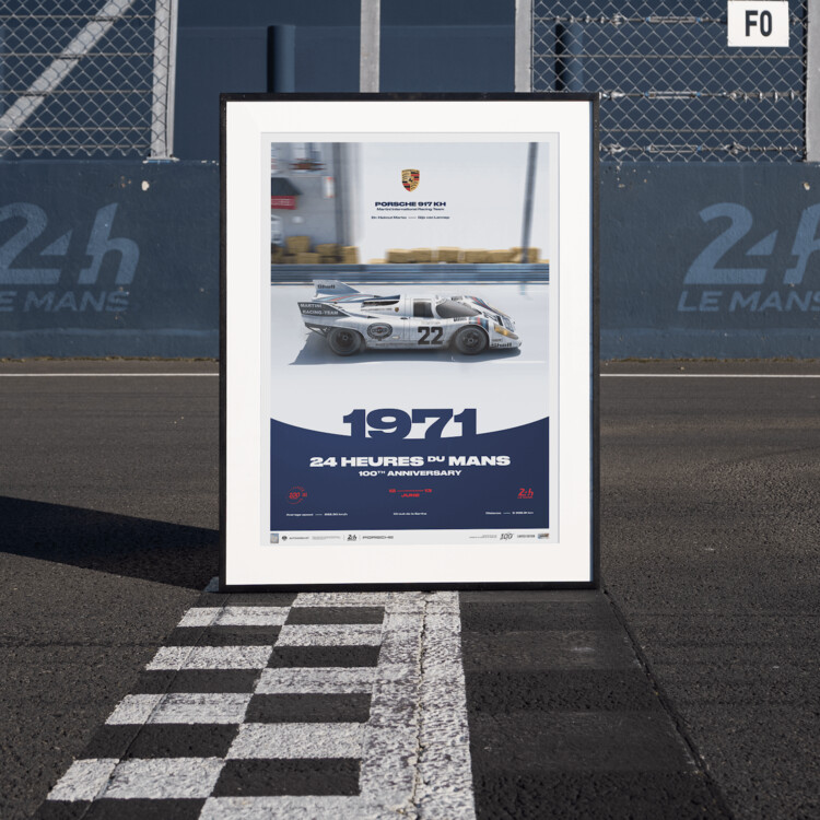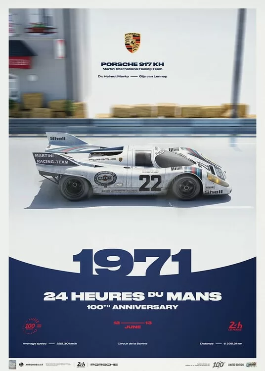 In 1971, the Porsche 917 KH in Martini livery won the prestigious 24 Hours of Le Mans race, setting two records with a distance of 5,335 kilometres and an average speed of 222.3 km/h. Driven by Gijs van Lennep and Helmut Marko, the car featured tail fins on both sides, giving it more directional stability and reducing drag. The car was also the first Porsche to race with a magnesium space frame, a material that was considerably lighter than aluminium, allowing for a 55-litre oil tank.