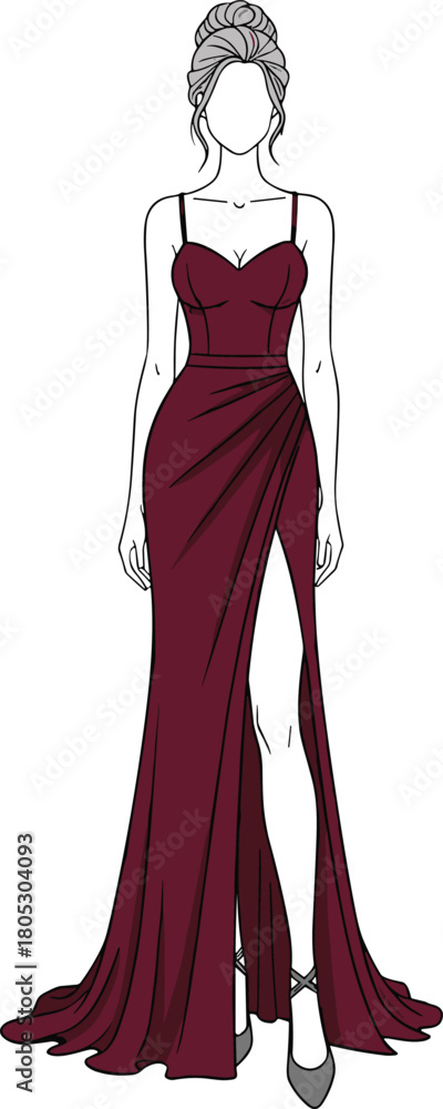 Tablou pe pânză Young woman model standing in elegant maroon evening gown with high leg slit fashion flat vector illustration