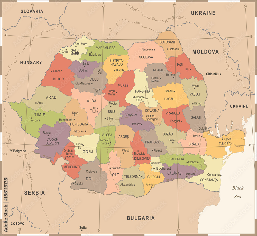 Tablou pe pânză Romania Map - Vintage Detailed Vector Illustration