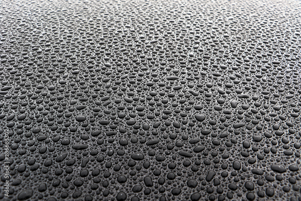 Tablou pe pânză hundreds and thousands of water droplets beading on a gloss black surface of a w