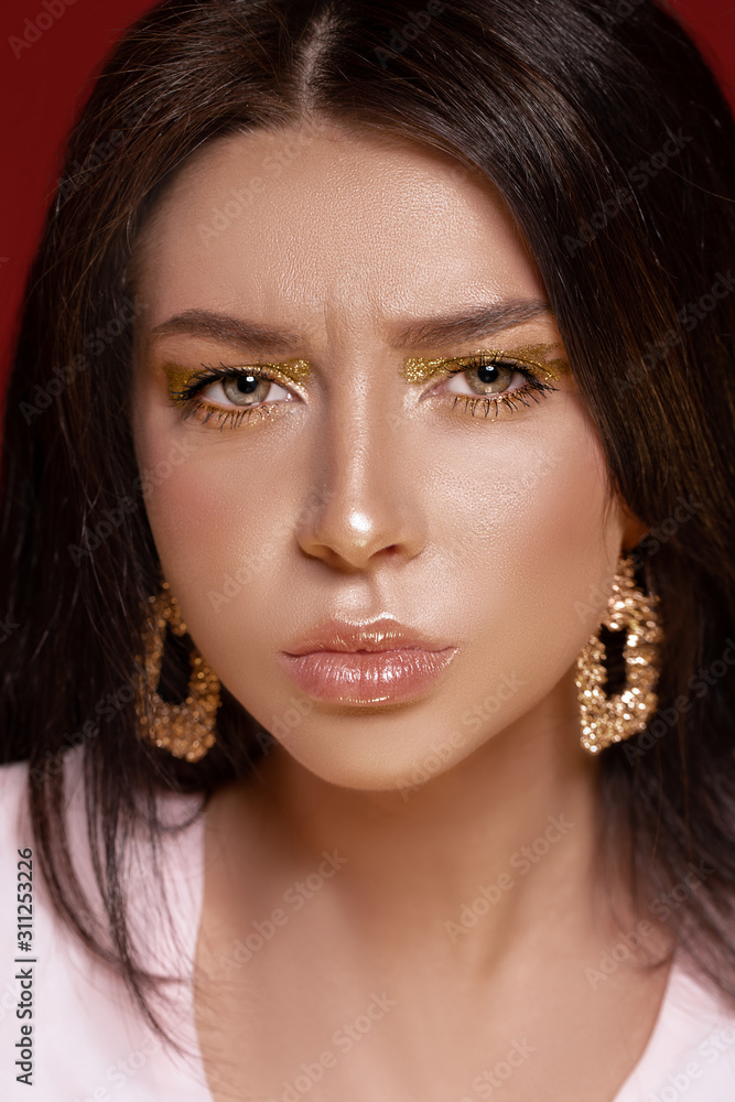 Tablou pe pânză Portrait of beautiful frowns woman with gold smokey eyes,perfect tanned skin and