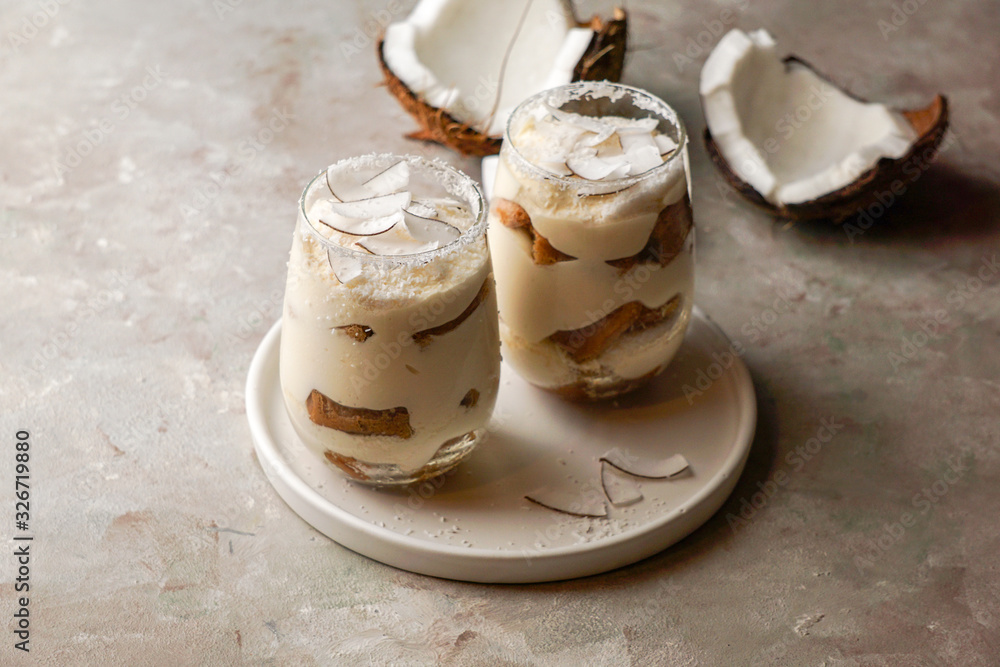 Tablou pe pânză coconut tiramisu in glass, typical desert of Latin America region, Cuba and Colo