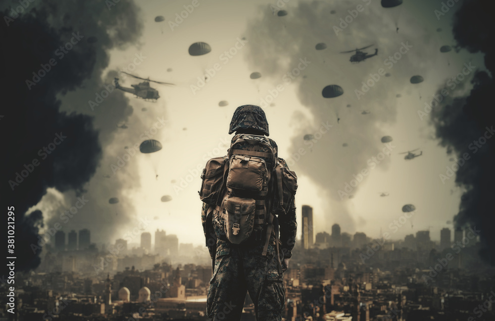 Tablou pe pânză A soldier watching forces and helicopters in the sky top of destroyed city