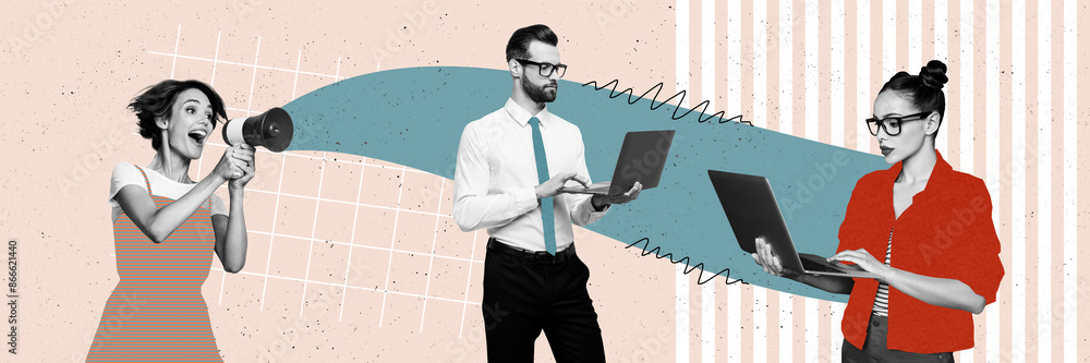 Tablou pe pânză Composite panoramic collage of business partners type macbook device freelance g