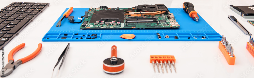 Fotografie The repairman works in technical support, is engaged in the restoration and cleaning of the laptop