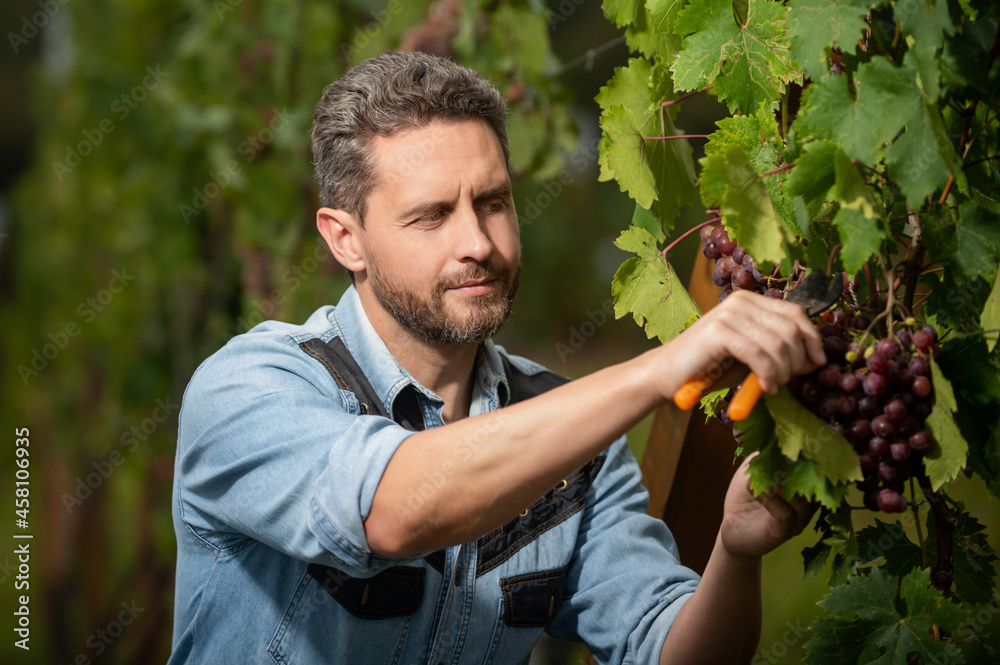 Fotografie wine maker cutting grapevine with garden scissors, winery